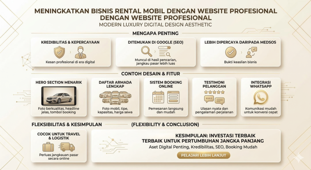 Di era digital saat ini, memiliki website profesional menjadi salah satu faktor penting bagi bisnis rental mobil untuk meningkatkan kepercayaan pelanggan dan memperluas jangkauan pasar. Banyak calon pelanggan yang mencari layanan transportasi melalui internet sebelum memutuskan untuk melakukan pemesanan.
